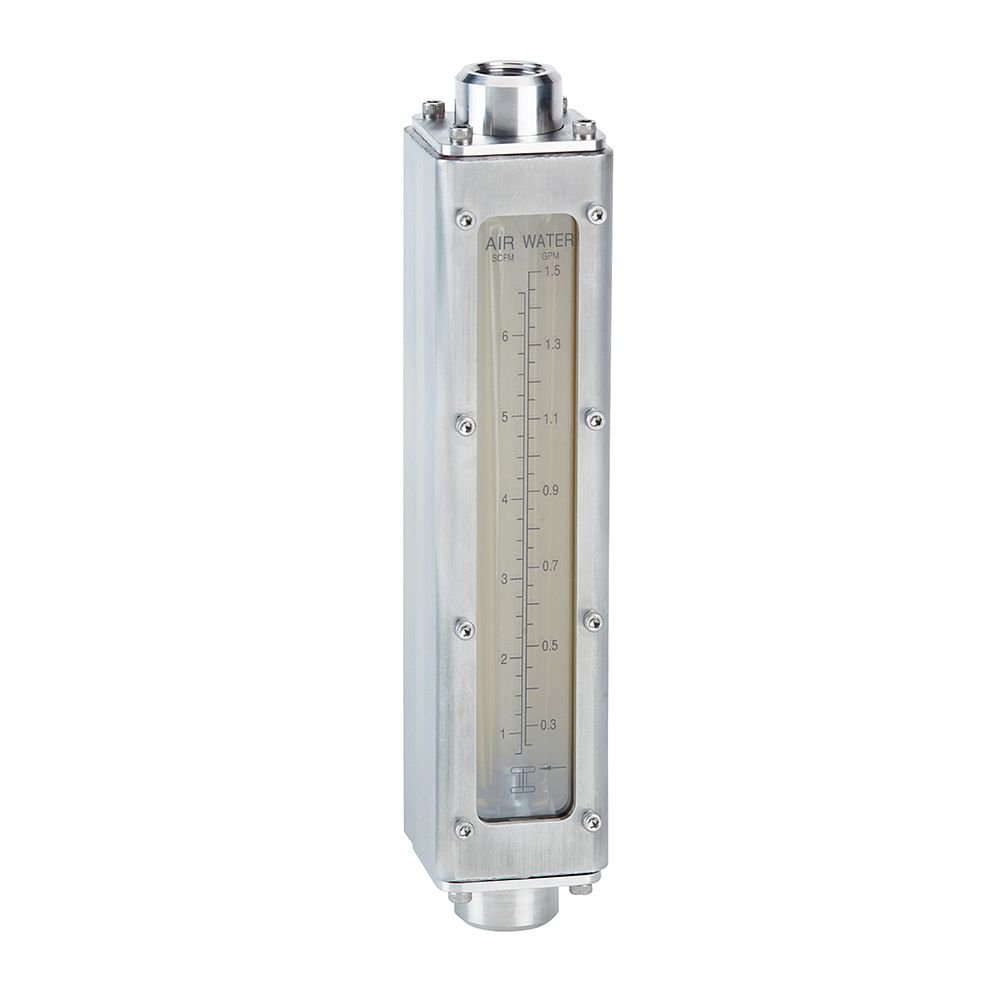 Ideal for industrial applications, the Series IF Industrial Direct Reading Flowmeters are fully enclosed in a brushed stainless steel case. The flowmeters can directly measure flow rates up to 116 GPM (439 lpm) for water and 250 SCFM (7080 lpm) for air service. The detachable, clear 3/16″ thick polycarbonate front shield provides protection at maximum rated temperature and pressure. Each unit is designed with female NPT end fittings for easy in-line installation.